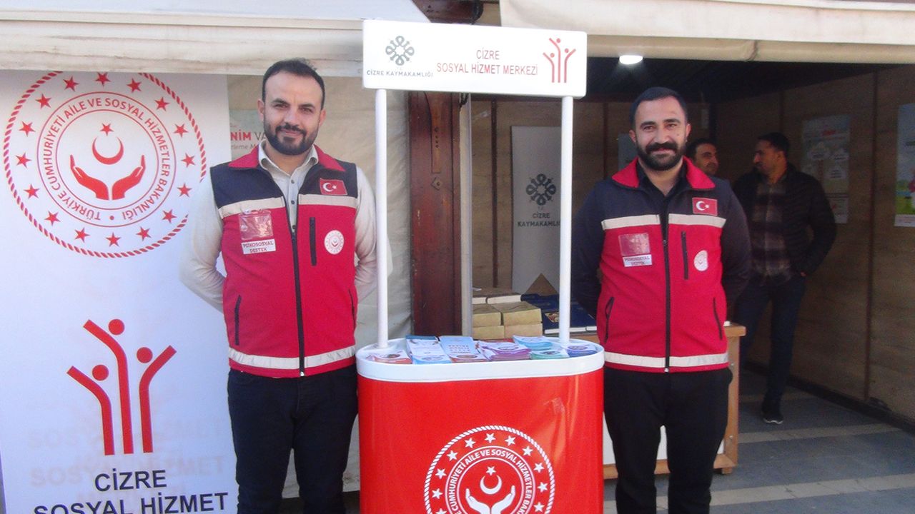 Cizre Sosyal hizmet merkezi standında broşür dağıtan Salih Atilla, “Aile sosyal hizmetler bakanlığının sosyal hizmet merkezinin yaptığı çalışmalarla faaliyetlerle ilgili yaptığı tanıtım broşürlerini dağıtıyoruz. Bakanlığımızın yaptığı mevcut faaliyetlerle ilgili tanıtımlar yapıyoruz.” diye konuştu.