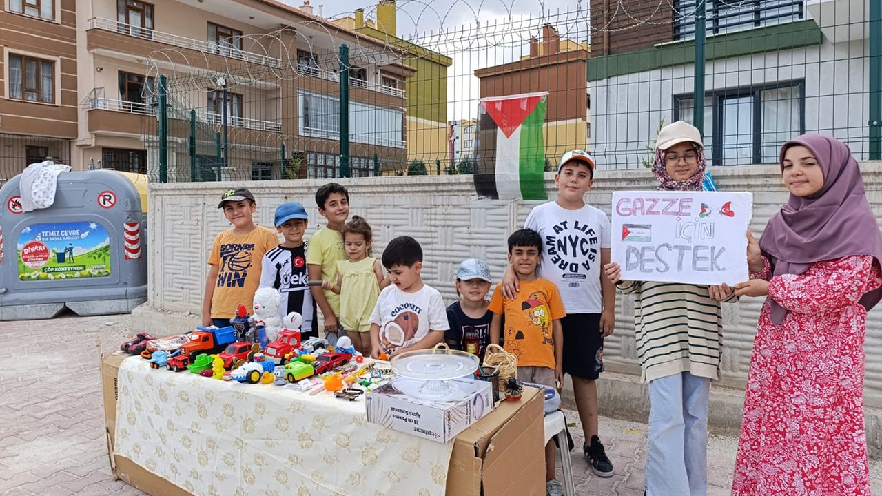 Konya'nın merkez Karatay ilçesinde bir araya gelen çocuklar evlerindeki oyuncaları satıp gelirini Gazze'ye ulaştırmak üzere stant açtı.