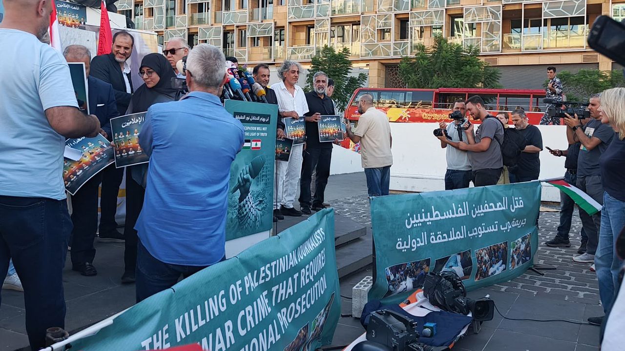 Katılımcılar Lübnan ve Filistin bayraklarını taşıdı, şehit gazetecilerin fotoğraflarını gösterdi ve "israil gazetecileri, yazarları ve fotoğrafçıları öldürüyor", "Gazetecilerin kanıyla özgürlük gerçeği yazılır" yazılı pankartlar açtı.