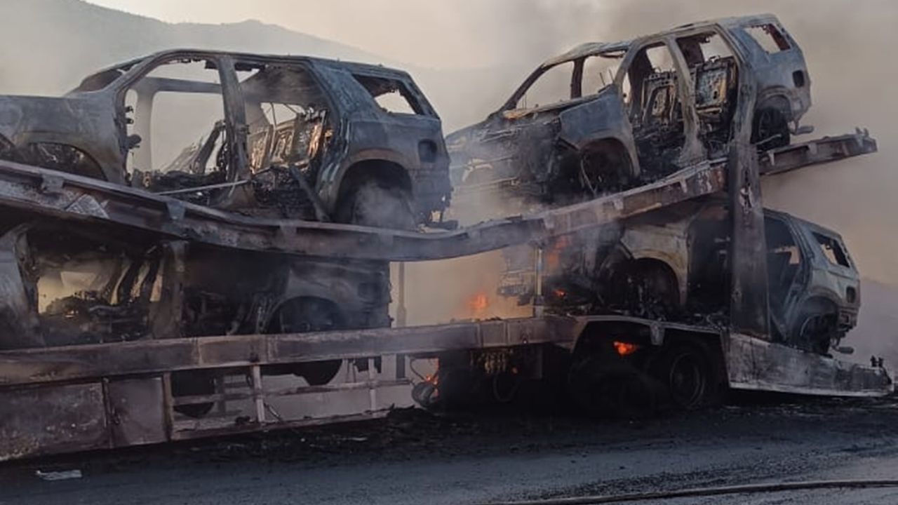 Sürücüsü ve plakası henüz öğrenilemeyen lüks araç yüklü tır, henüz bilinmeyen bir nedenle alev aldı.