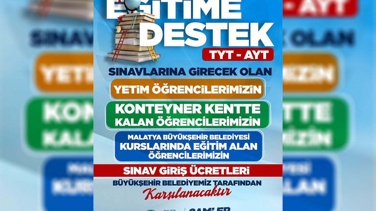 Malatya Büyükşehir Belediyesinden yapılan açıklamaya göre 2025 yılında yapılacak olan Yüksek Öğretim Kurumları Sınavı (YKS) kapsamında Alan Yeterlilik Testleri (AYT) ve Temel Yeterlilik Testi (TYT) sınavlarına girecek olan yetim öğrenciler, konteyner kentlerde kalan öğrenciler ile Malatya Büyükşehir Belediyesi kurslarında eğitim gören üniversite adaylarının sınav giriş ücretleri belediye tarafından karşılanacak.