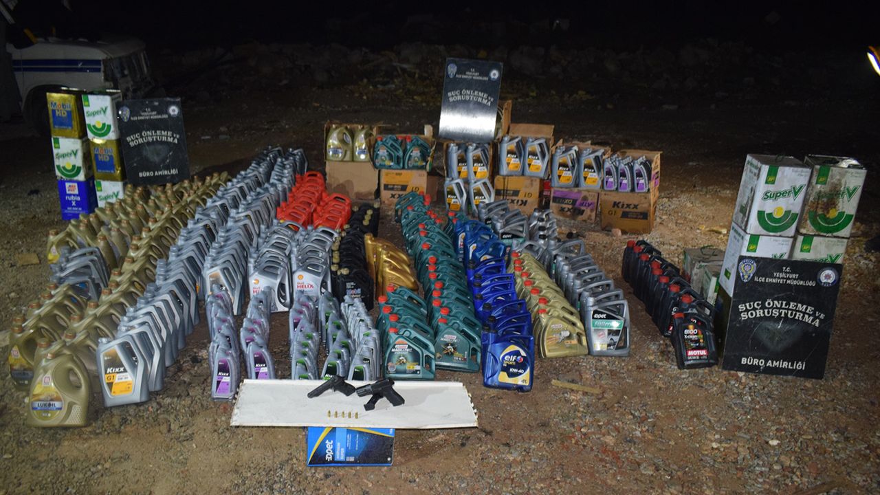 Şahıslara ait iş yerinde yapılan aramalarda su tankı içerisine gizlenmiş 325 adet farklı markalardaki motor yağı, 1 adet ruhsatsız tabanca ve 1 adet kurusıkı tabanca ele geçirildi.