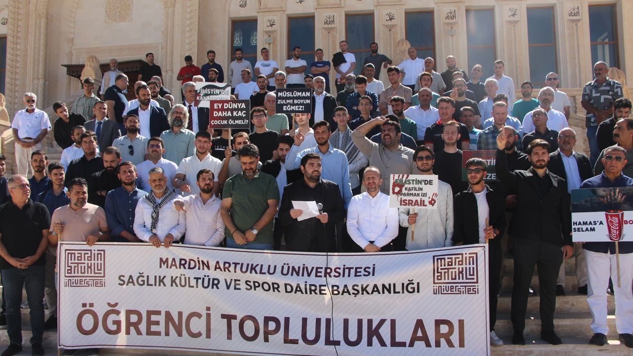 Mardin Artuklu Üniversitesi Sağlık Kültür ve Spor Daire Başkanlığı Öğrenci Toplulukları tarafından üniversite yerleşkesinde bulunan caminin önünde, işgal rejimin Küresel Sumud Filosu’na yönelik yaptığı saldırılar tel'in edildi.