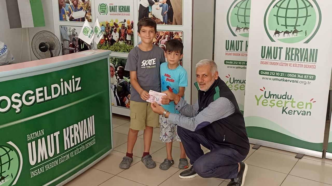 Batman'da iki küçük kardeşin örnek davranışı, büyük bir duyarlılığı gözler önüne serdi. Muhammed Ensar ve Efecan Olçay kardeşler, bir süredir kumbaralarında biriktirdikleri harçlıklarını, Gazze'deki mazlumlara yardım amacıyla Umut Kervanı Batman Derneği'ne teslim etti.