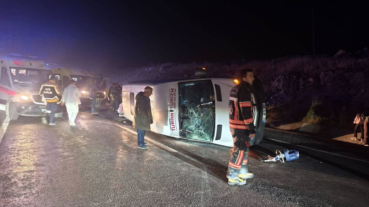 Çarpışmanın etkisiyle minibüs devrilerek yan yattı.