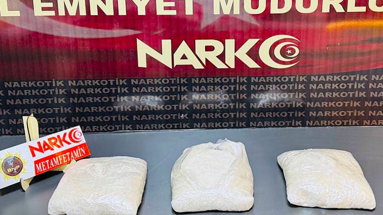 Şahsın üzeri ve eşyalarında yapılan aramada, piyasa değeri yüksek miktarda olan 3 kilo metamfetamin uyuşturucu maddesi bulundu.