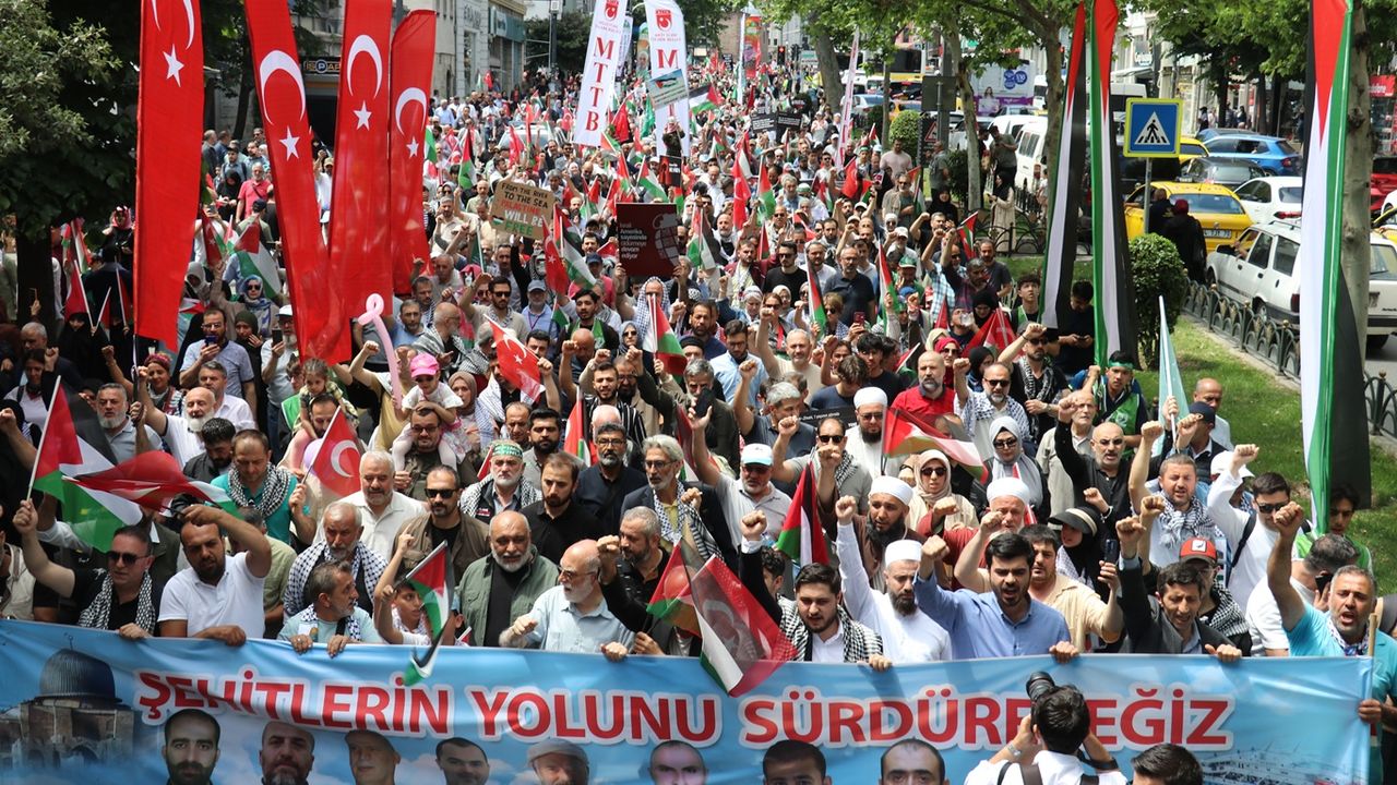 İslami kuruluşların çağrısıyla Mavi Marmara'nın 15'inci yıl dönümünde Fatih Camii'nde öğle namazında bir araya gelen on binlerce kişi, kortej eşliğinde Filistin lehine, işgal rejimi ve destekçilerinin aleyhine atılan sloganlarla Ayasofya Meydanı'na kadar yürüdü.