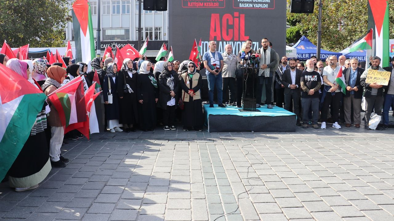 Eminönü Meydanı'nda gerçekleştirilen basın açıklamasına, Uluslararası Özgürlük Filosu ve STK temsilcileri ile halktan çok sayıda kişi katılım sağladı.