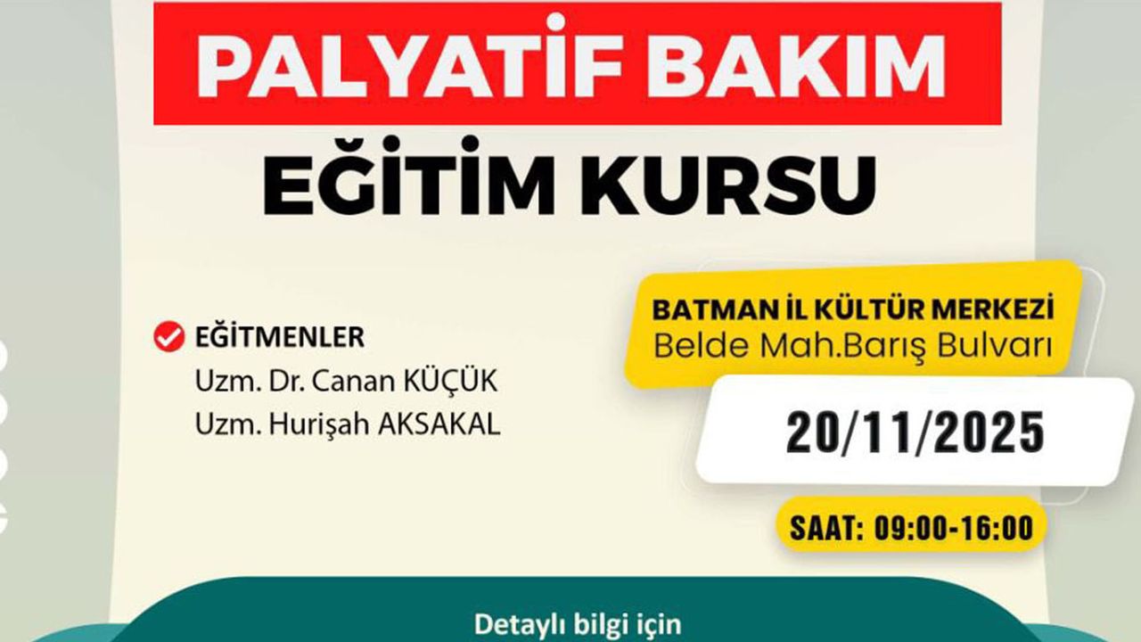 İl Sağlık Müdürü Uzman Doktor Murat Solmaz, Batman İl Sağlık Müdürlüğü tarafından düzenlenen bu eğitimin hem sağlık çalışanlarının bilgi ve beceri seviyesini yükseltmeyi hem de bölgede sunulan palyatif bakım hizmetlerinin kalitesini artırmayı hedeflediğini belirtti. (İLKHA)