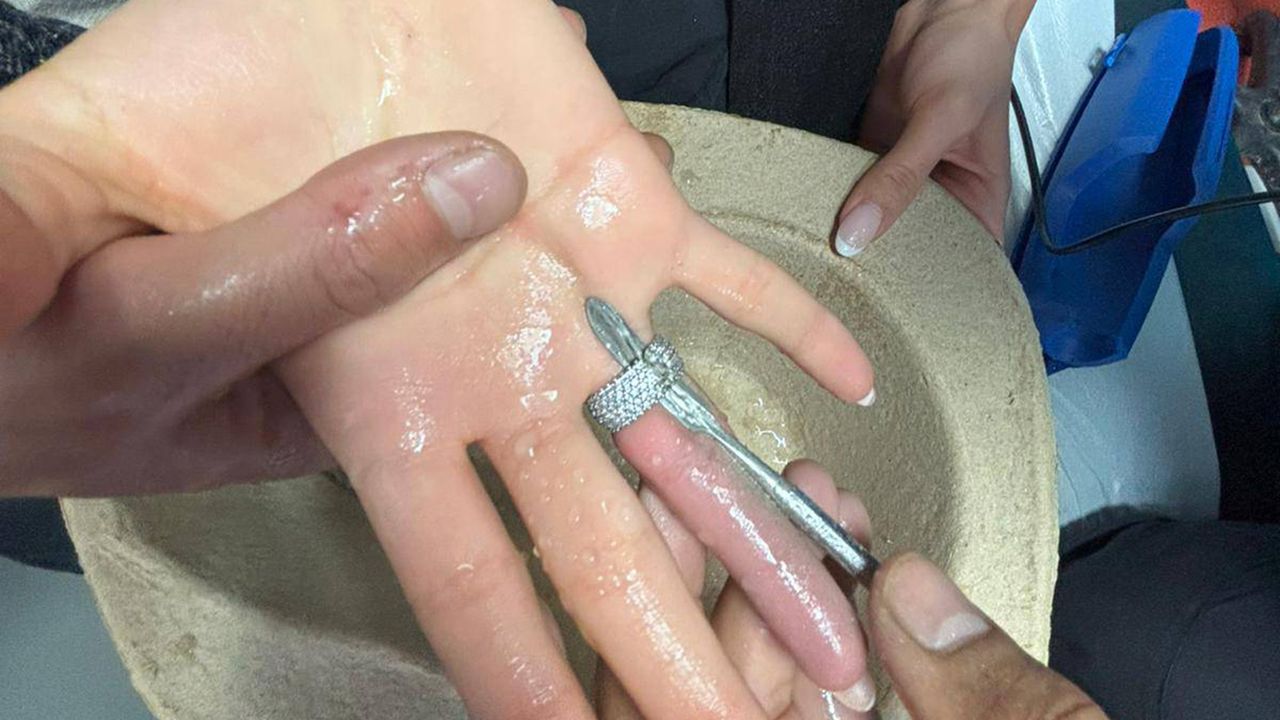 Doktorların ilk müdahalesine rağmen çıkarılamayan yüzük, olay yerine çağrılan itfaiye ekiplerinin özel ekipmanlarıyla, doktor gözetiminde dikkatlice kesilerek çıkarıldı.