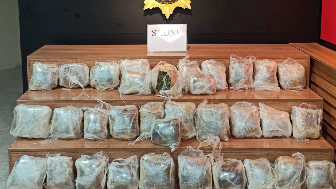 Yapılan aramada 33 parça halinde toplam 24 kilogram Skunk maddesi bulunurken, ele geçirilen uyuşturucunun yaklaşık 24 bin kişiyi zehirleyebilecek nitelikte olduğu belirtildi.