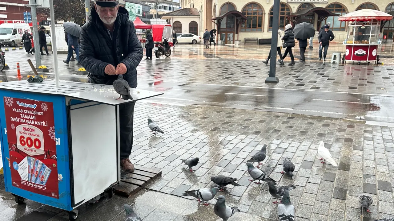 Düzce'de bir seyyar 'talih kuşu' bayii güvercinleri kendi elleriyle besledi.Sefer DEMİR / DÜZCE (İGFA) - Düzce'de Milli Piyango seyyar bayi bilet satışı sırasında güvercinleri de kendi elleriyle besledi.