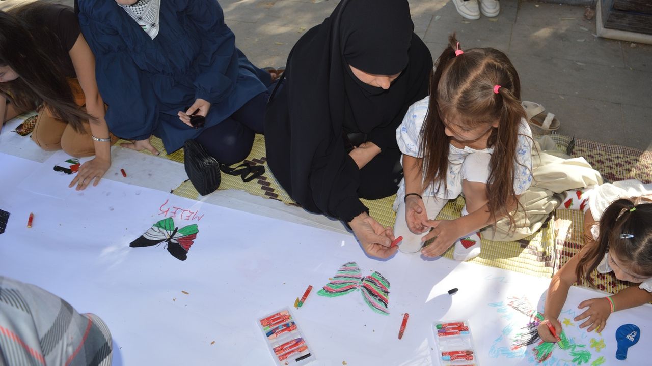 15 Temmuz Demokrasi Meydanı’nda gerçekleştirilen etkinlikte, alana serilen büyük bir tuvale çocuklar Filistin bayrağı, barış sembolleri ve Gazze’ye destek mesajları çizdi.