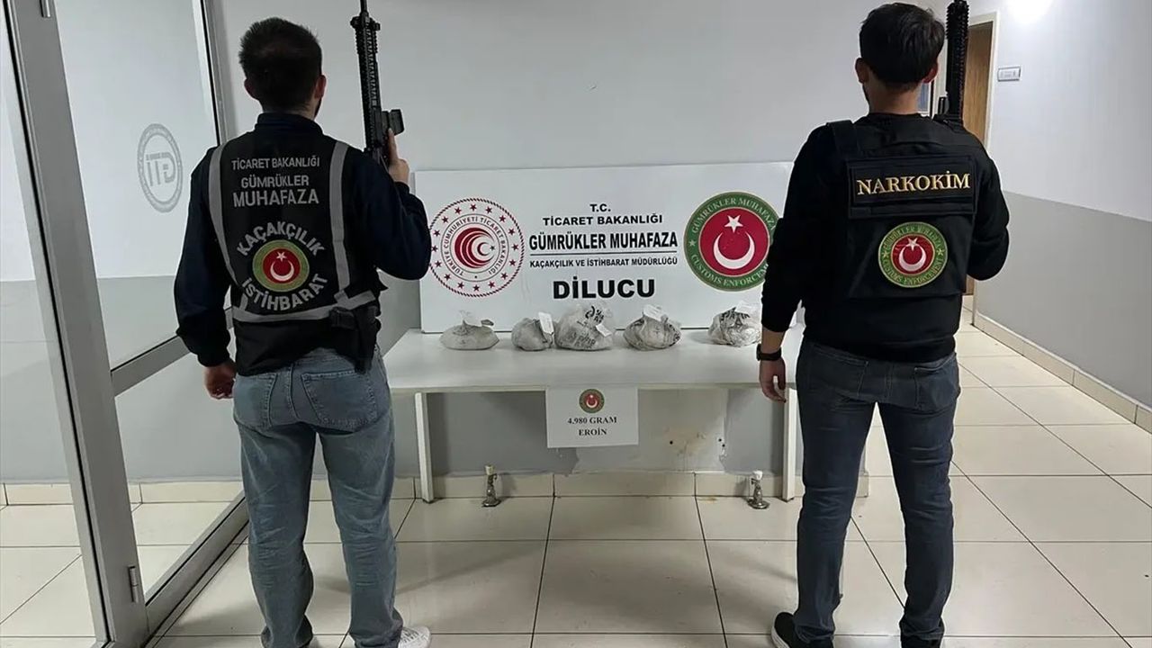 Yapılan aramada, çekicinin yedek lastiğinin içinde alüminyum folyolara sarılı 5 poşette 4 kilo 980 gram eroin ele geçirildi.