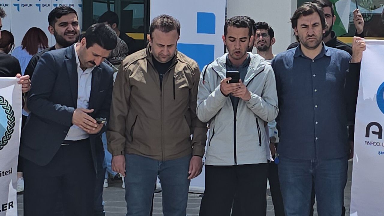 Üniversite kampusun yemekhane önünde yapılan basın açıklamasını, topluluklar adına Mehmet Emin Gök okudu.