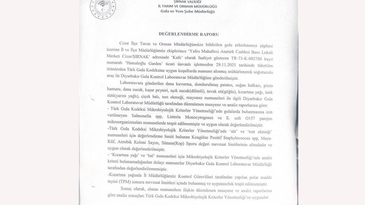 "Cizre İlçe Tarım ve Orman Müdürlüğüne yapılan ihbarın ardından, Yafes Mahallesi Atatürk Caddesi Baro Lokali Merkez Cizre/Şırnak adresinde “kafe” olarak faaliyet gösteren ve TR-73-K-002786 kayıt numarasına sahip “Hamaloğlu Garden” ticari unvanlı işletmeden 29 Kasım 2025 tarihinde tüketilen ürünlerden numuneler alındı. Numuneler, uygun koşullarda mühürlenerek soğutuculu araçla Diyarbakır Gıda Kontrol Laboratuvar Müdürlüğüne gönderildi. Laboratuvarda yapılan analizlerde; dana kavurma, dondurulmuş patates, soğan halkası, pizza hamuru, dana sucuk, kaşar peyniri, açık sucuk (dilimli), tavuk eti (göğüs), kızartma yağı, yarım yağlı inek sütü, çiçek balı, tost ekmeği ve mayonez numuneleri incelendi. Yapılan muayene ve analizler sonucunda, Türk Gıda Kodeksi Mikrobiyolojik Kriterler Yönetmeliği kapsamında gıdalarda bulunmasına izin verilmeyen Salmonella spp., Listeria monocytogenes ve E. coli O157 gibi patojen mikroorganizmalara rastlanmadığı tespit edildi. Süt ve tost ekmeği numunelerinde değerlendirilen Koagülaz Pozitif Staphylococcus spp., maya-küf, aerobik koloni sayısı ve sünme (rop) sporu değerlerinin mevzuat limitlerinin altında olduğu belirtildi. Kızartma yağı ve bal numuneleri için ilgili yönetmelikte mikrobiyolojik kriter bulunmadığından değerlendirme yapılamazken, kızartma yağında yapılan toplam polar madde (TPM) analizinin de mevzuat sınırları içerisinde olduğu kaydedildi."