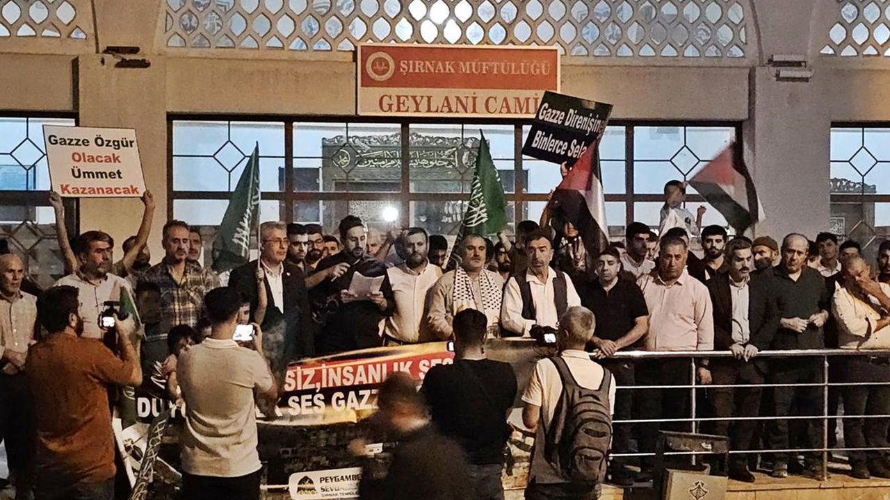 Peygamber Sevdalıları öncülüğünde yatsı namazı sonrası Geylani Cami önünde bir araya gelen Şırnaklılar, Küresel Sumud Filosu'nun korunması gerektiği çağrısında bulundu.