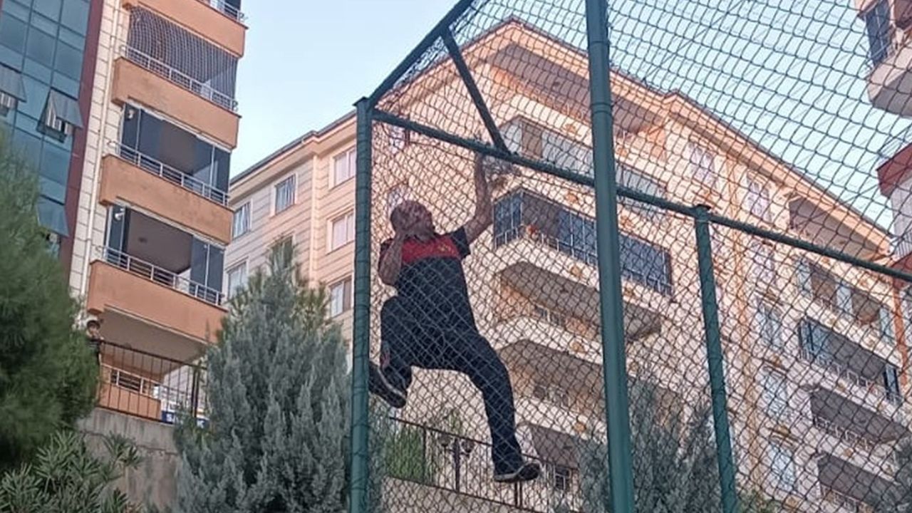Site sakinleri, çim saha tel örgülerinin arasında sıkışıp çıkamayan yavru kediyi fark ederek durumu itfaiyeye bildirdi.