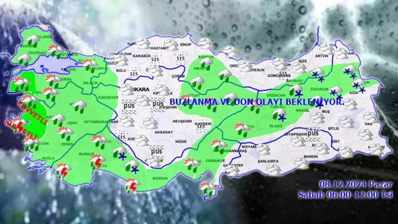 Meteoroloji'den yapılan kuvvetli uyarıya göre de yağışların, Edirne, Çanakkale, Balıkesir'in batısı, İzmir, Manisa ve Aydın ile Pazar günü (08/12/2024) ilk saatlerden itibaren Muğla'nın batısında aralıklı ve yerel olarak kuvvetli (21-50 kg/m2), Muğla merkez ve doğusunda yerel olarak çok kuvvetli ve şiddetli (51-100 kg/m2) gök gürültülü sağanak yağış beklendiğinden yaşanabilecek olumsuzluklara karşı dikkatli ve tedbirli olunması istendi.