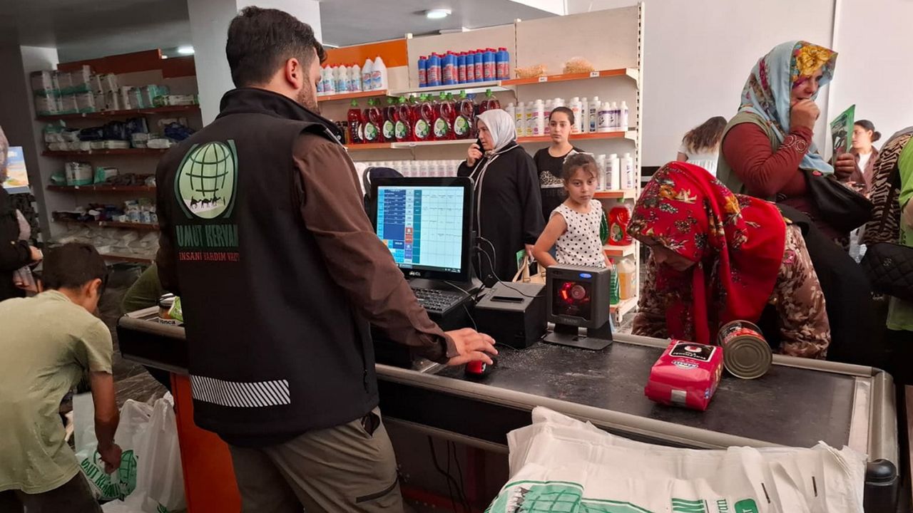 Sosyal market uygulamasıyla gerçekleştirilen yardım organizasyonuyla, ihtiyaç sahibi aileler Umut Kervanı’na gelerek ihtiyaçlarını gönüllerince seçme imkânı buldu.