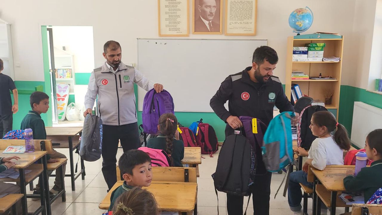 Okullardaki öğrencilere ikramlık dağıtan Umut Kervanı gönüllüleri daha sonra maddi durumu iyi olmayan onlarca öğrenciye içinde kırtasiye malzemelerinin tamamının olduğu çantaları hediye etti.