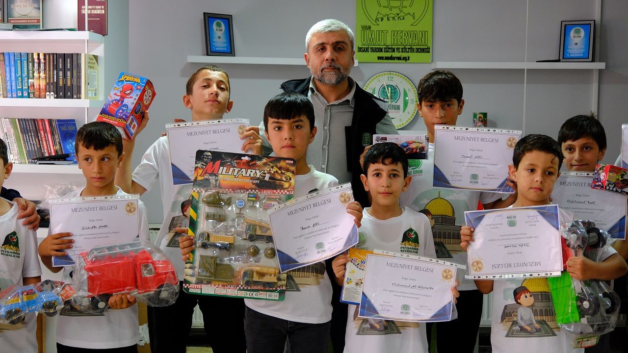Mezuniyet törenine ilişkin konuşan Vatan, “Bugün yaz okulumuzun son günüydü. Burada öğrencilerimizi bir araya getirerek onlara bir mezuniyet töreni hazırladık. Başarılarına göre kendilerine mezuniyet belgesi takdim ettik. Bununla beraber bir anı olması amacıyla kendilerine çam sakızı çoban armağanı birer hediye takdim ettik. Çocuklarımıza hediyelerini bir eğlence olması hasebiyle çekiliş yaparak verdik. Bu vesileyle bize destek olan hayırsever kardeşlerimize de teşekkür ediyoruz.” ifadelerini kullandı.