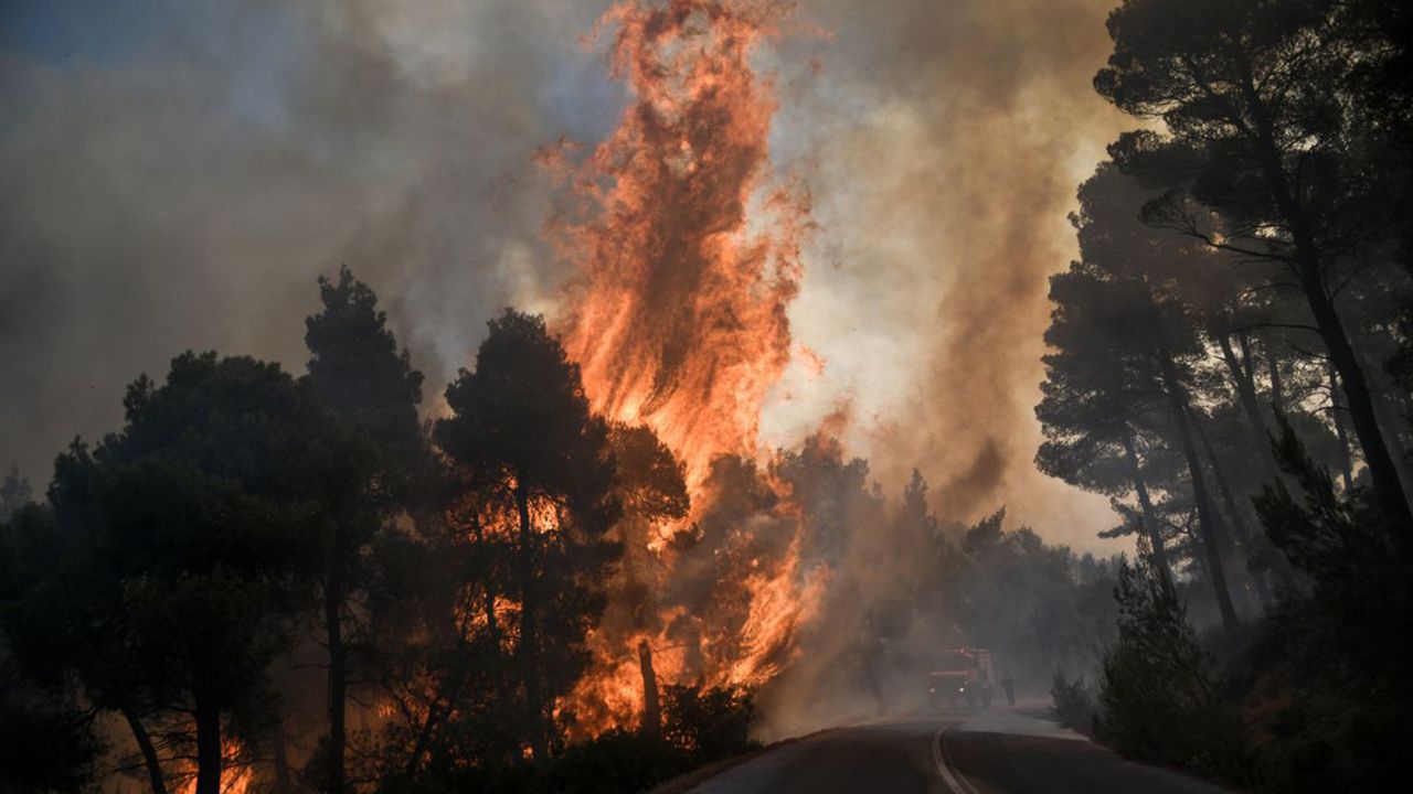 Yunanistan'ın Doğu Attika bölgesindeki Oropos'a bağlı Asprohori yerleşim biriminde dün çıkan orman yangını devam ediyor.