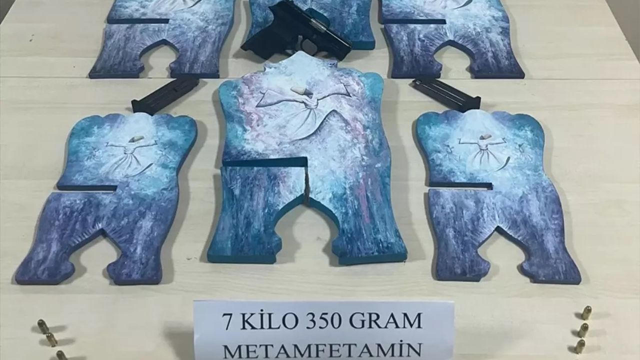 Şüphelinin ikametinde yapılan aramalarda, , preslenerek gizlemek amaçlı semazen figürüyle boyanmış rahle içinde 7 kilo 350 gram sentetik uyuşturucu, tabanca ve 11 mermi ele geçirildi.