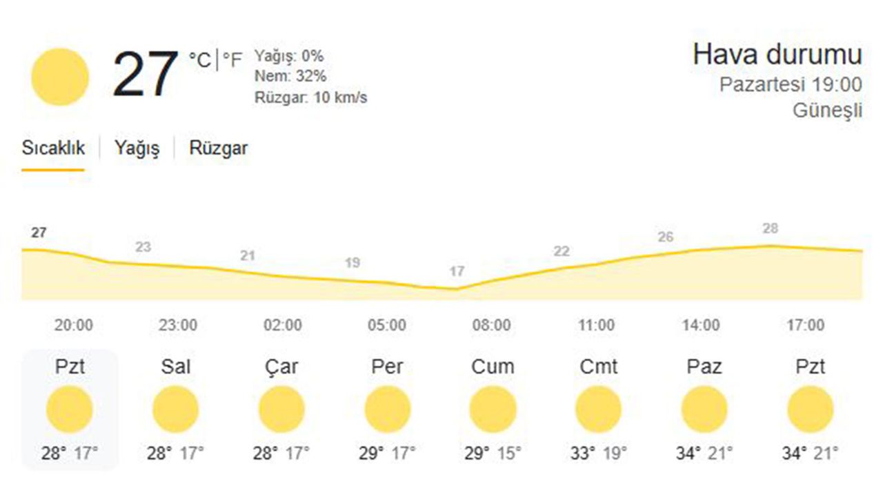 25 Ağustos ile başlayan haftada Konya'da gündüz saatlerinde sıcaklıkların 35 dereceye kadar çıkması bekleniyor. Geceleri ise hava biraz serinleyecek ve sıcaklıklar 17–19 derece civarına kadar inecek.