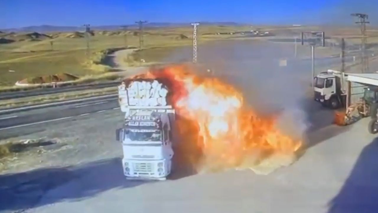 Durumu fark eden sürücü, alev alan kamyonu kırsal Baroğlu Mahalle mevkiindeki bir akaryakıt istasyonu alanına çekti.