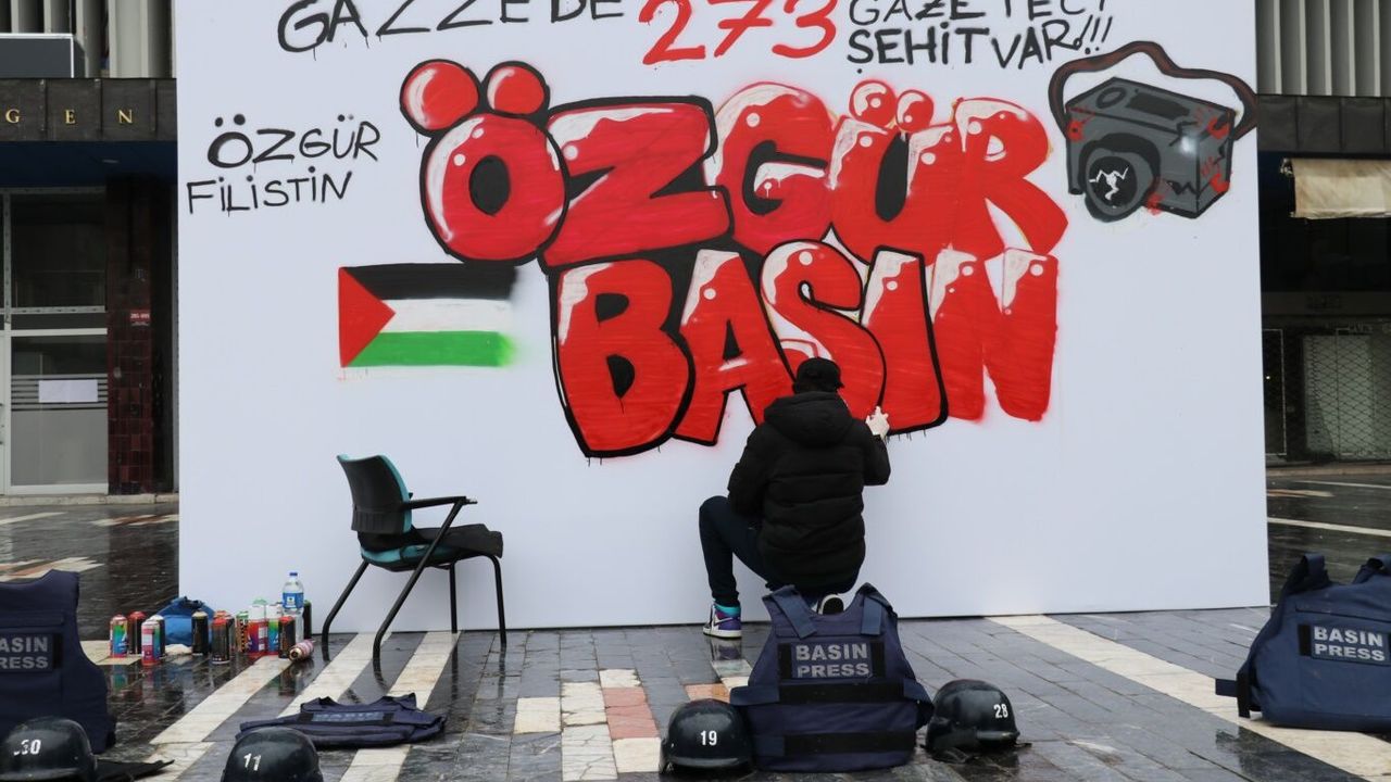 Ankara Ulus Meydanı’nda gerçekleştirilen etkinlikte, 7 Ekim 2023 beri Gazze’de şehit olmuş 273 gazeteci anılırken, hazırlanan tematik grafiti çalışmasıyla gazetecilere yönelik saldırılara dikkat çekildi.