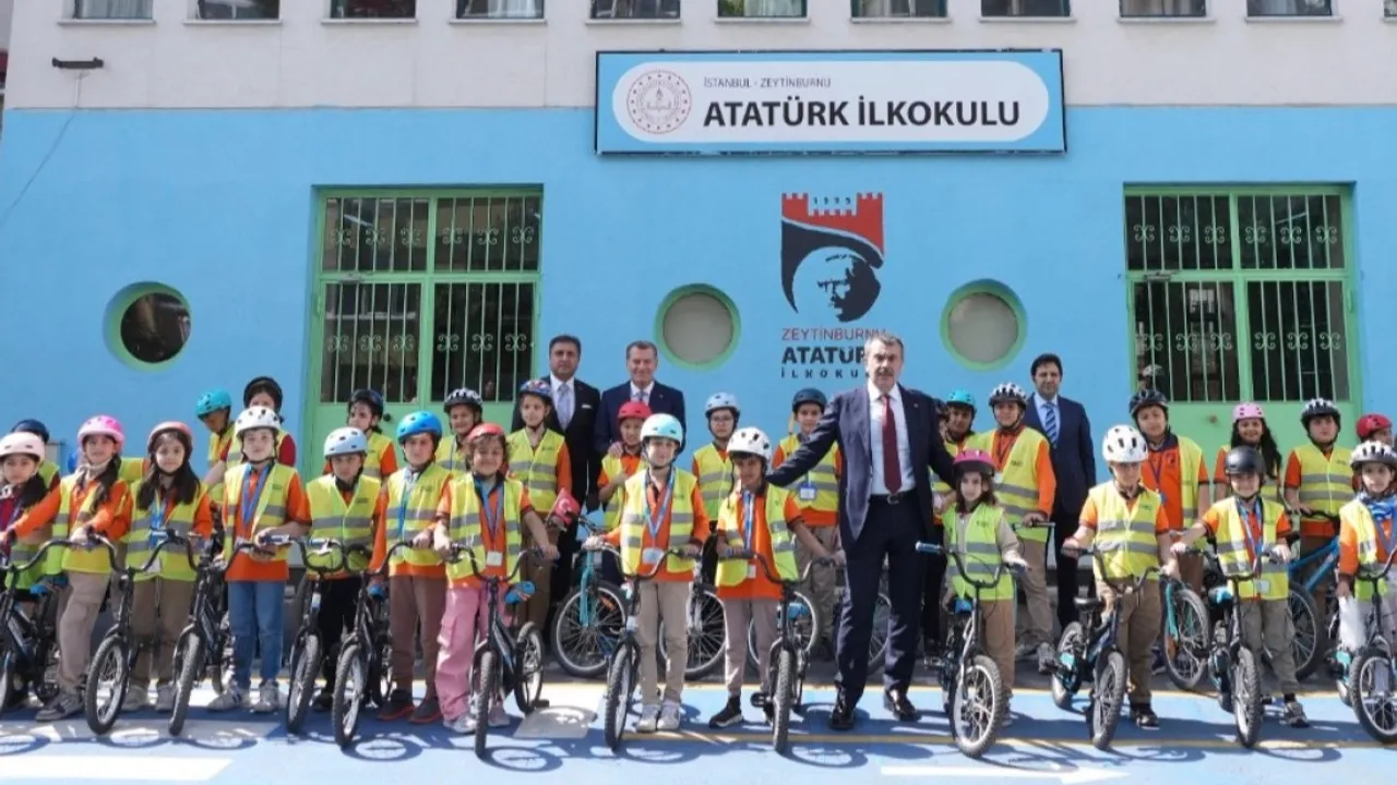 Bakan Tekin, her hafta 1 saat beden eğitimi dersi kapsamında öğrencilere güvenli sürüş, trafik kuralları ile ilk yardım gibi temel bilgilerin de verildiği bisiklet sürme etkinliğine katıldı.