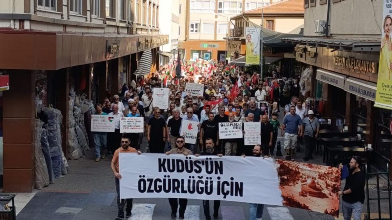 Vatandaşların yoğun katılım gösterdiği yürüyüşte, Filistin’e uygulanan ambargo ve siyonist rejimin insan hakları ihlalleri protesto edildi. Yürüyüşün ardından Zağnos Paşa Camii önünde basın açıklaması yapıldı.