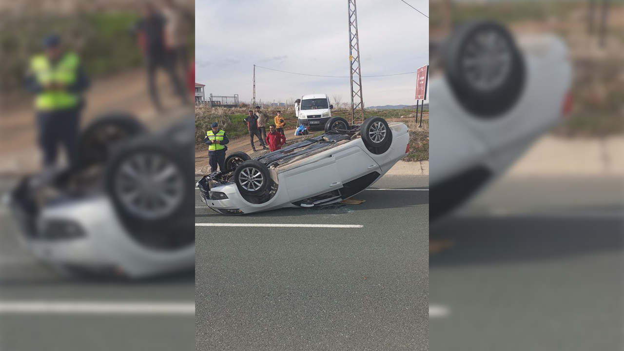 Çarpmanın etkisiyle savrulan otomobil, yol ortasında takla atarak ters şekilde durdu.