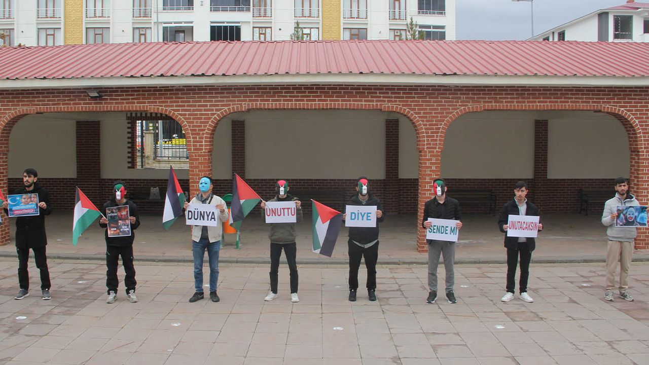 Gazze’de yaşanan siyonist vahşetin unutturulmamasına dikkat çekmek amacıyla gerçekleştirilen etkinlikte, Doğu Türkistan ve Filistin bayrakları maskelere çizilerek katılımcılar tarafından takıldı. Etkinlikte ayrıca, Cuma namazından çıkan öğrencilere Gazze ve Doğu Türkistan’daki zulmün devam ettiği hatırlatıldı.