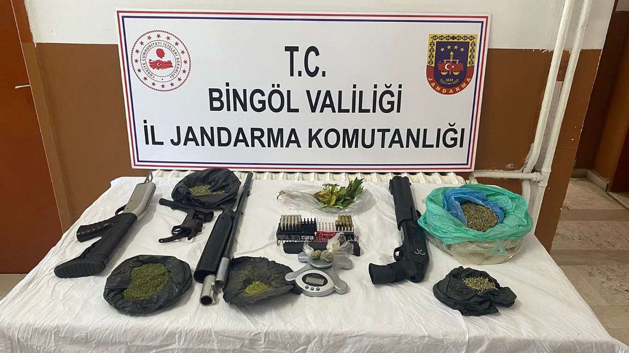 Araçta yapılan aramalarda, üç kalaşnikof tüfek, bir tabanca, beş kalaşnikof şarjörü, iki balistik yelek, 61 adet 9x19 fişek, 166 adet kalaşnikof fişeği, 504 gram skunk, 41 gram kokain, 129 gram toz esrar ve üç hassas terazi ele geçirildi.