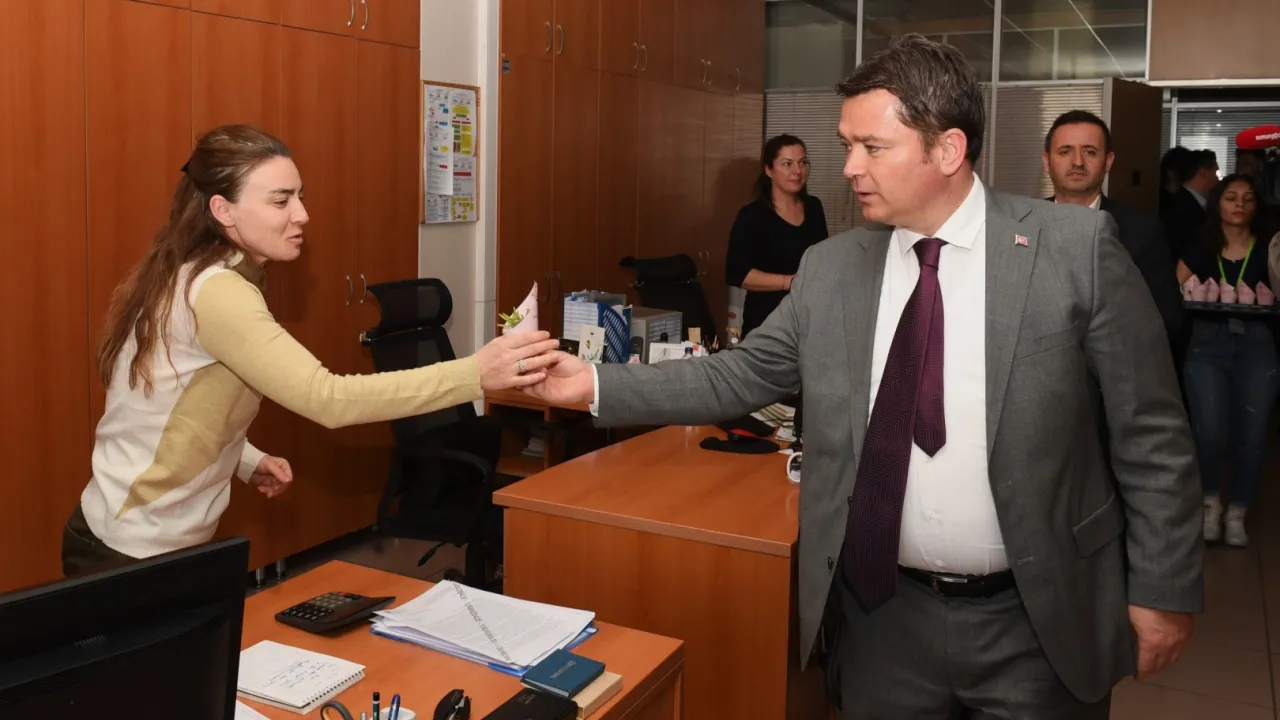 Bursa'da Osmangazi Belediye Başkanı Erkan Aydın, 8 Mart Dünya Kadınlar Günü öncesindeki son mesai gününde, personelin kadınların gününü kutlayarak çiçek hediye etti.BURSA (İGFA) - Bursa'da Osmangazi Belediye Başkanı Erkan Aydın, 8 Mart Dünya Kadınlar Günü etkinliklerini erken başlattı.