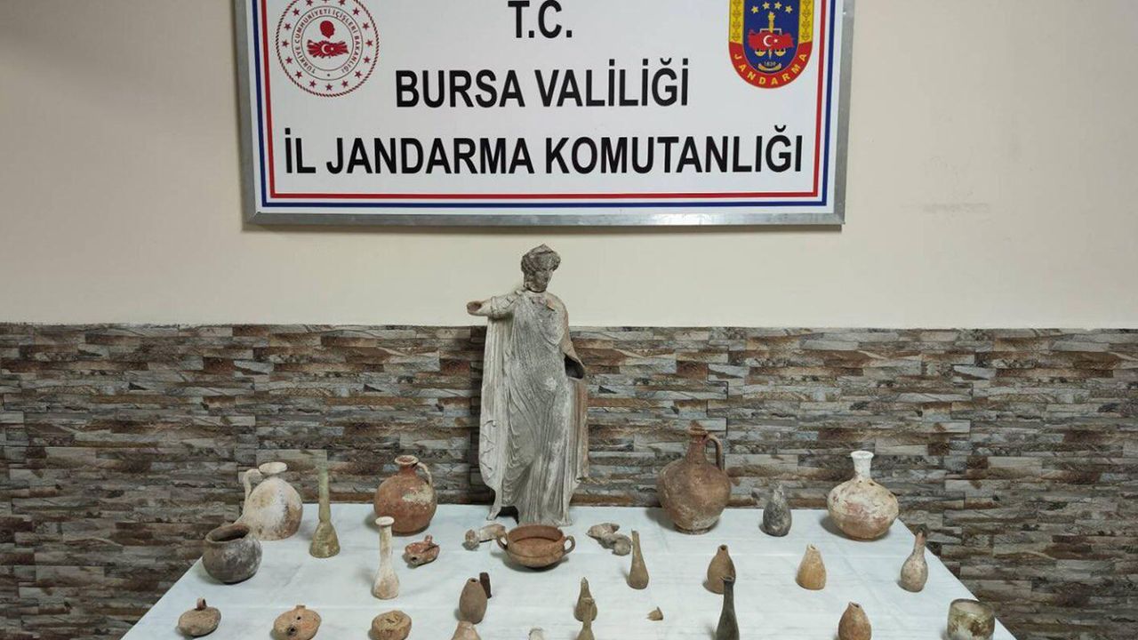 Bursa İl Jandarma Komutanlığı'na bağlı İstihbarat Şube Müdürlüğü ve Nilüfer İlçe Jandarma Komutanlığı ekiplerince yürütülen istihbari çalışmalar sonucunda gerçekleştirilen operasyonda; 29 adet tarihi obje, yaklaşık 60 cm uzunluğunda, Roma ve Bizans dönemlerine ait olduğu değerlendirilen 1 adet heykel, 1 adet el dedektörü ele geçirildi.