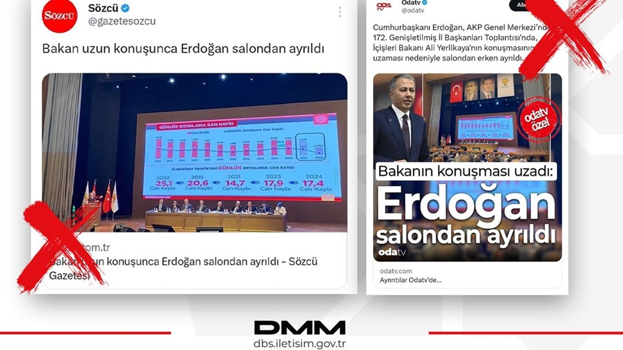 DMM'den yapılan açıklamada, bazı basın-yayın organlarında “Cumhurbaşkanı Erdoğan, İçişleri Bakanı Ali Yerlikaya’nın konuşması uzayınca salondan erken ayrıldı” şeklinde yer alan iddiaların tümüyle gerçek dışı olduğu ve kamuoyunu yanıltmaya yönelik dezenformasyon içerdiğini belirtildi.