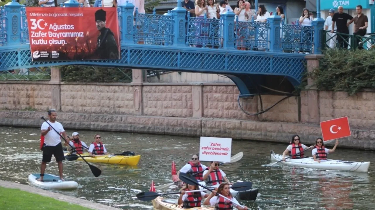 Ellerinde Türk bayraklarıyla Porsuk Çayı üzerinde ilerleyen Eskişehir Büyükşehir Spor Kulübü kano sporcuları, izleyenlere hem duygusal hem de gurur dolu anlar yaşattı. Su üzerindeki bu muhteşem kortej, 30 Ağustos’un ruhunu yansıtan görsel bir şölene dönüştü.