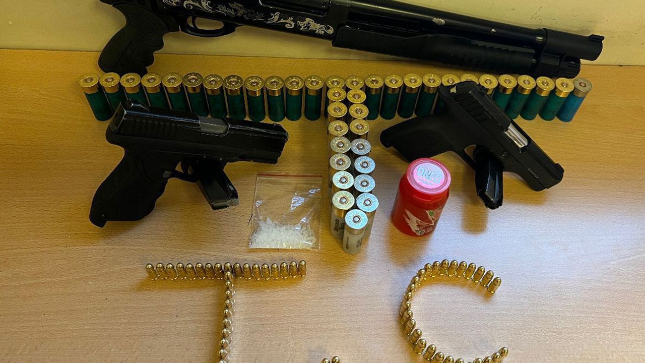 Yapılan aramada, 2 adet ruhsatsız tabanca, 1 adet pompalı tüfek,103 adet fişek ve bir miktar uyuşturucu madde ele geçirildi.