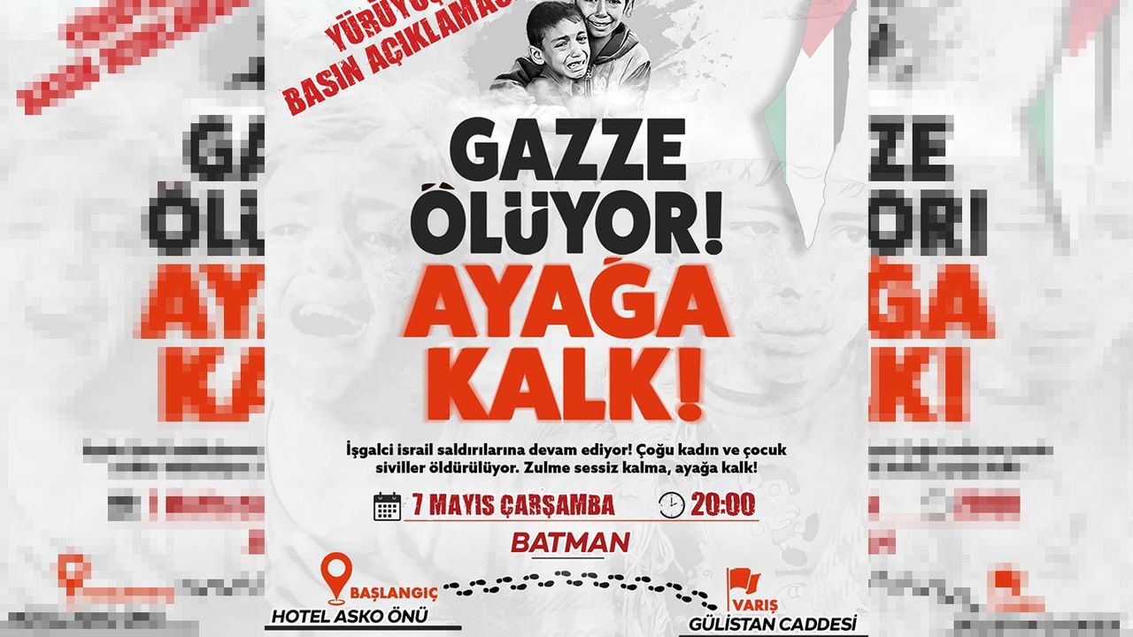 Batman'da faaliyet gösteren sivil toplum kuruluşları, Siyonist işgal rejiminin Gazze'ye yönelik saldırılarına dikkat çekmek ve Filistin halkına destek vermek amacıyla 7 Mayıs Çarşamba günü kapsamlı bir yürüyüş ve basın açıklaması düzenliyor.