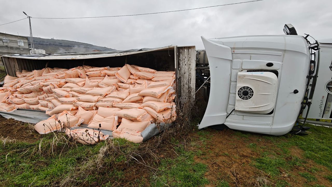 Devrilmenin etkisiyle tırda yüklü olan gübreler yola savruldu.