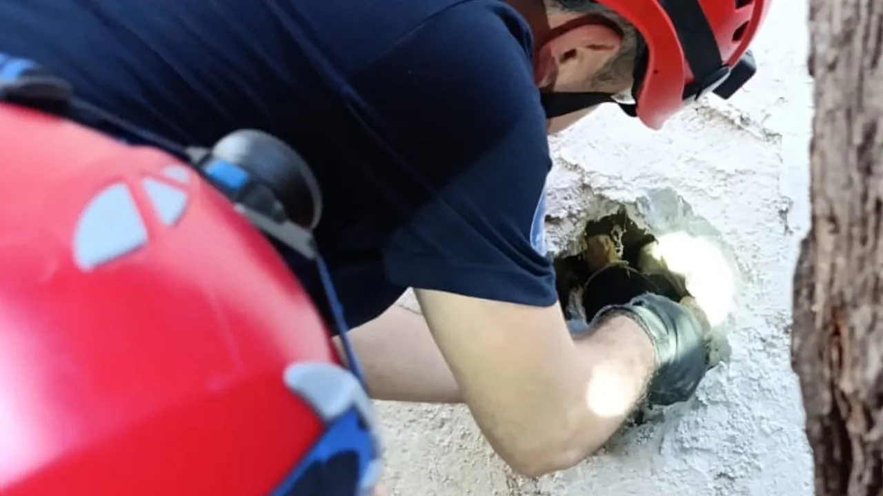 Yapılan taramada kedinin bina temelinin içerisinde yer alan havalandırma borularında olduğu belirlendi. İtfaiyenin kurtarma ekipleri, duvar içerisinde yaklaşık 80 santimetre alan açtı. Kedinin zarar görmesini önlemek amacıyla 4 kurtarma ekibi 4 saat süren titiz bir çalışmanın ardından, sevimli yavruyu bulunduğu yerden çıkarmayı başardı.