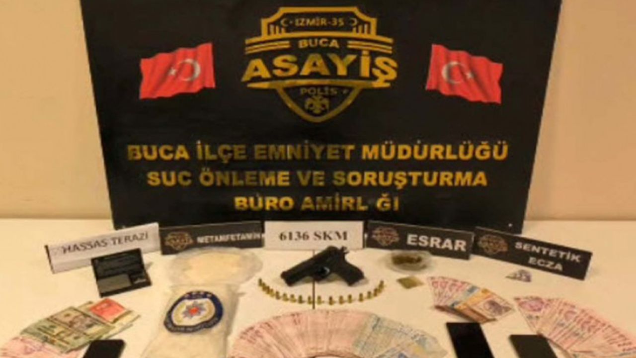 Aramalarda 1 kilo 611 gram metamfetamin, 1 ruhsatsız tabanca, 18 gram esrar ve 1 hassas terazi ele geçirildi.