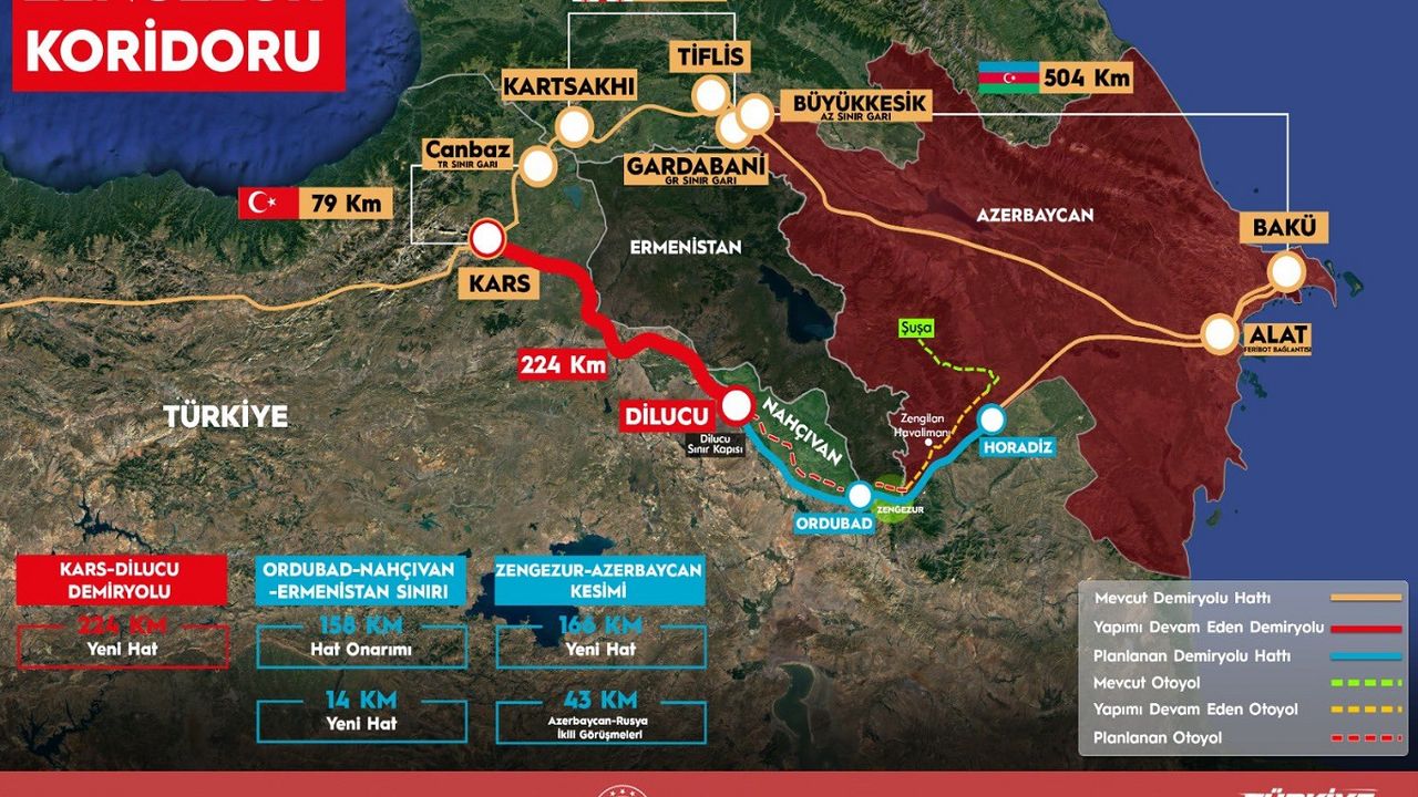 Güney Kafkasya'daki ekonomik işbirliğini artıracak Zengezur Koridoru'nun işlerlik kazanmasıyla birlikte Pekin'den Londra'ya kadar uzanan doğu-batı hattı daha verimli işleyecek. Orta Koridor'un demir yolu ve kara yolu yük taşıma kapasitesi artacak." (İLKHA)