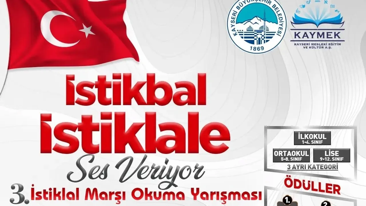 Kayseri Büyükşehir Belediyesi’nin eğitim kuruluşu KAYMEK, 12 Mart İstiklal Marşı’nın kabulünün 104’üncü yılı dolayısıyla anlam dolu bir etkinlik düzenliyor. Bu yıl, 3’üncüsü gerçekleştirilecek "İstikbal İstiklale Ses Veriyor" İstiklal Marşı Okuma Yarışması’na başvurular devam ediyor.KAYSERİ (İGFA) - Kayseri Mesleki Eğitim ve Kültür A.Ş.’nin (KAYMEK) bu yıl, üçüncüsünü düzenlediği İstiklal Marşı Okuma Yarışması, sadece bir yarışma olmanın ötesinde, Türk milletinin milli ve manevi değerlerinin geleceğe taşınması adına önem arz ediyor. Kayseri il sınırları içerisinde ikamet eden ilkokul, ortaokul ve lise öğrencilerinin katılabileceği yarışma, gençlerin İstiklal Şairi Mehmet Akif Ersoy'un derin düşüncelerini ve Türk milletine olan bağlılıklarını özümsemelerini sağlamayı amaçlıyor.