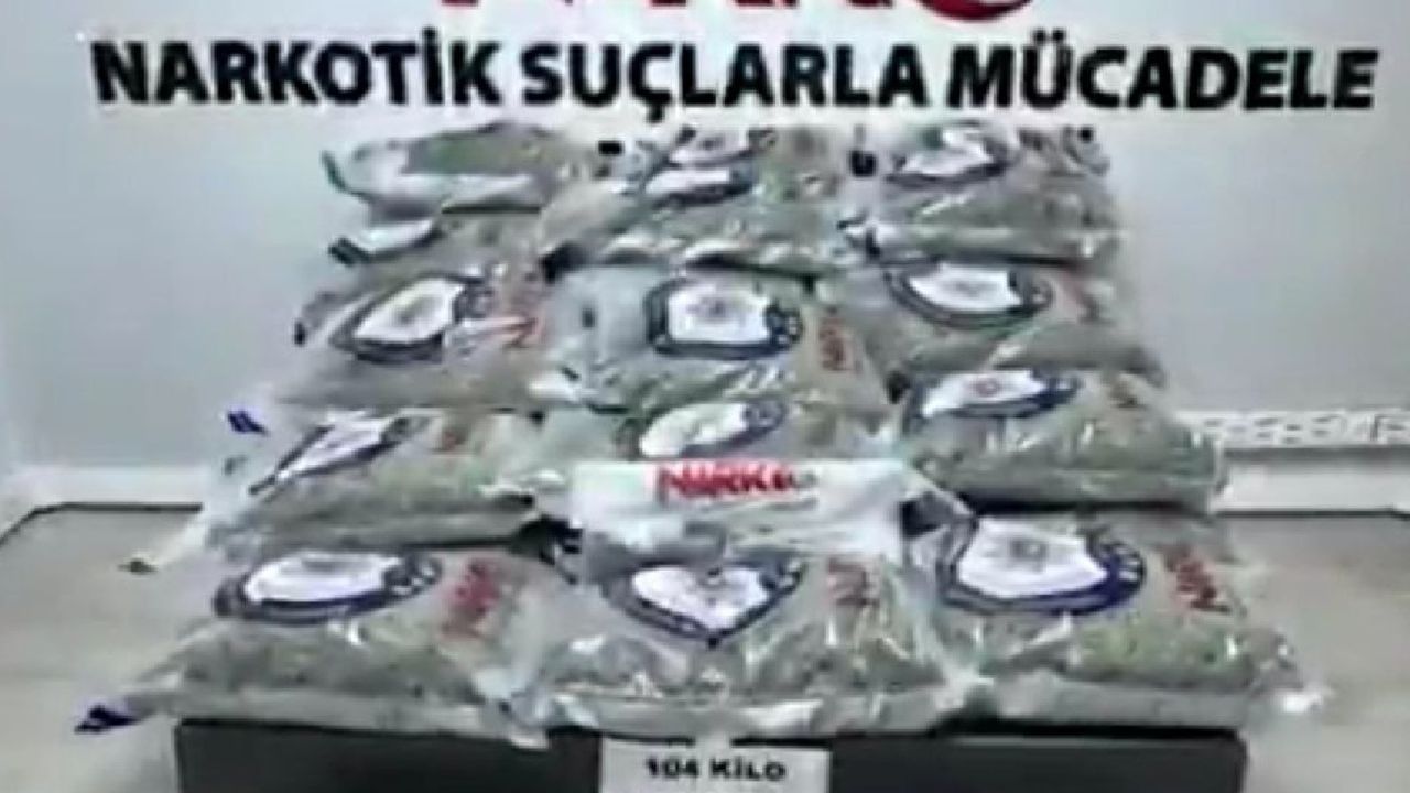 Şüphelilerin ikametlerinde ve araçlarında yapılan aramalarda 104 kilogram 710 gram narkotik madde, 1 hassas terazi ve çeşitli materyaller ele geçirildi.