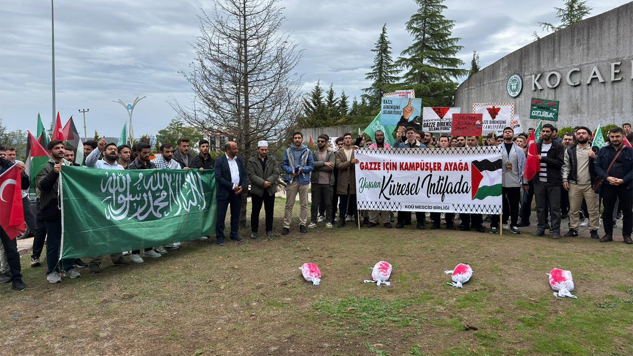 "Kocaeli Üniversitesi öğrencileri, akademisyenleri, öğrenci kulüpleri ve Mescid Birliği olarak, Uluslararası kamuoyunun gözü önünde gerçekleşen saldırılar, özellikle kadınları ve çocukları hedef alarak açık bir soykırıma dönüşmüştür. İşgalci siyonist rejim, yalnızca askeri operasyonlarla sınırlı kalmayıp; elektrik, su ve gıda erişiminin engellenmesi, okulların, çadırların ve hastanelerin bombalanması, yardıma giden sağlıkçıların katledilmesi, gazetecilerin diri diri yakılması gibi insanlık dışı yöntemlerle topyekûn bir yıkım politikası yürütmektedir. Bu eylemler hem uluslararası hukuk açısından açık bir savaş suçu, hem de ahlaki ve insani bakımdan büyük bir utançtır. Amerika, Avrupa Birliği, Birleşmiş Milletlerin ikiyüzlülüğünü ve çifte standardını tekrar görmüş olduk. Bu ikiyüzlülükleri bize şu sözü söyletiyor. İnsan hakları tüm insanlar için değil yalnızca siyonist zalimleri için geçerli olan bir sistemdir." açıklamasına yer verildi.