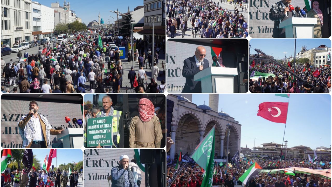 Alparslankılıç Meydanı’ndan başlayarak Mevlana Meydanı’na kadar süren yürüyüşe, binlerce kişi katıldı. Kadın-erkek her yaştan vatandaşın yer aldığı yürüyüşte, siyonist işgalcilerin Gazze’ye yönelik saldırılarına karşı tepki gösterildi.